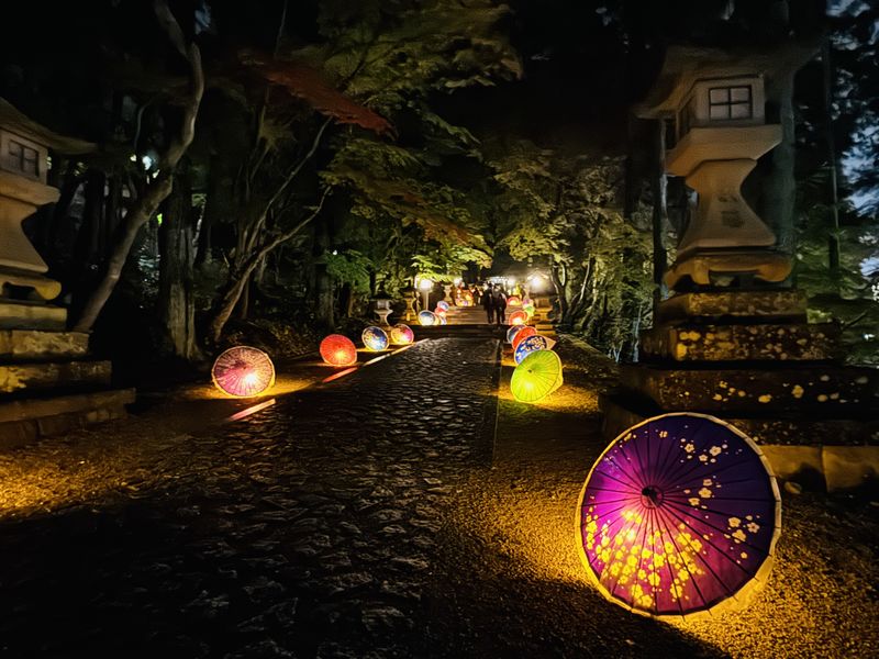 紅く染まるもみじと250本の和傘による演出、竹ランプによる光の鳥居など幻想的な空間演出とともに、獅子舞や太鼓、ハープなど、さまざまな演奏と舞が秋の宵を彩ります。